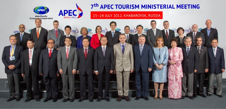 - We, the APEC Tourism Ministers and our senior representatives from Australia; Brunei Darussalam; Canada; Chile; People's Republic of China; Hong Kong, China; Indonesia; Japan; Republic of Korea; Malaysia; Mexico; Papua New Guinea, Peru; Republic of the Philippines; Russian Federation; Singapore; Chinese Taipei; Thailand; United States of America, and Viet Nam, met in our 7th APEC Tourism Ministerial Meeting (TMM) in Khabarovsk, Russian Federation on 24 July, 2012. The meeting was chaired by H.E. Mr. Alexander Radkov, Head of the Federal Agency for Tourism, Ministry of Culture of the Russian Federation.[1]