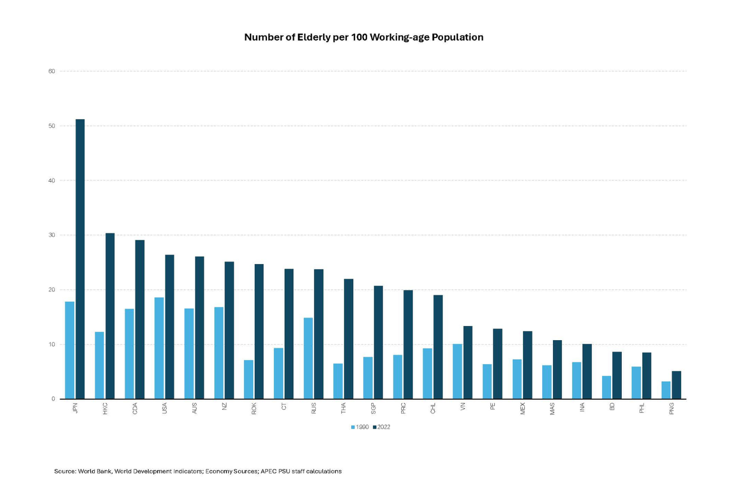 In APEC, at least half of the membership are facing rapidly ageing populations although at varying speeds. In 2022, over half of APEC economies reported an old-age dependency ratio ranging from 20 elderly to 51 elderly per 100 working-age individuals—a striking increase compared to 1990 when the highest ratio in the region was just 19 elderly per 100 working-age individuals. This underscores growing concerns about the pressures of an ageing population on economic stability and workforce sustainability, demanding tailored policy responses in the near term.
