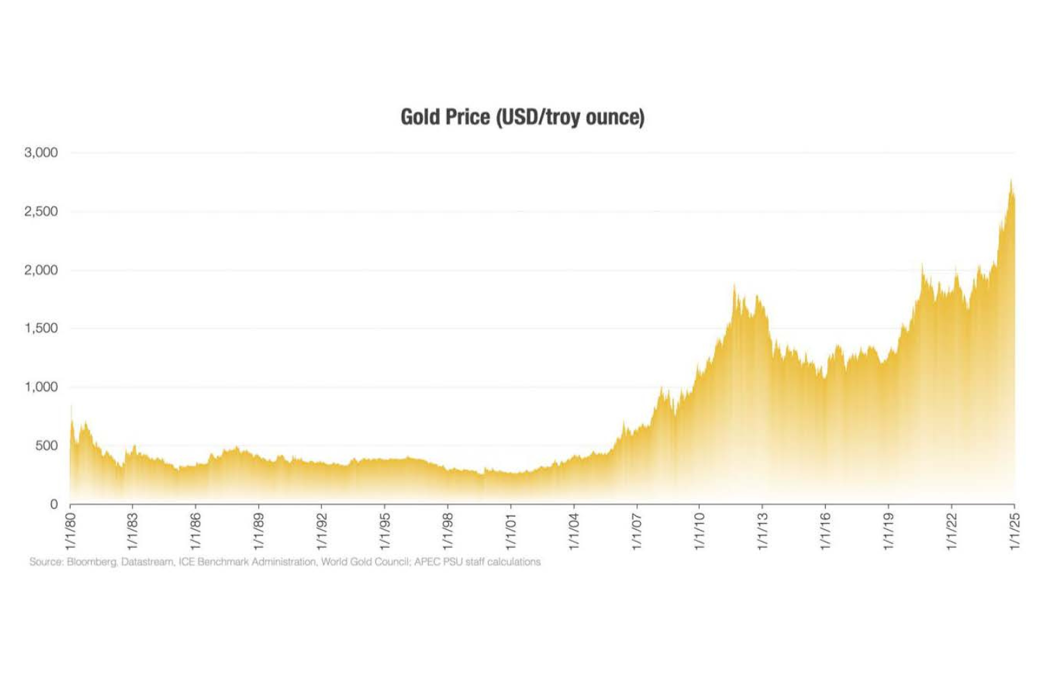 Rising global risks have spurred gold prices to record highs as investors seek safety in uncertain times. Indices measuring economic policy uncertainty have surged between 2020 and 2024, compared to the previous decade, while geopolitical risk indices have similarly escalated. Issues affecting sustainability are adding another layer of economic vulnerability as well.