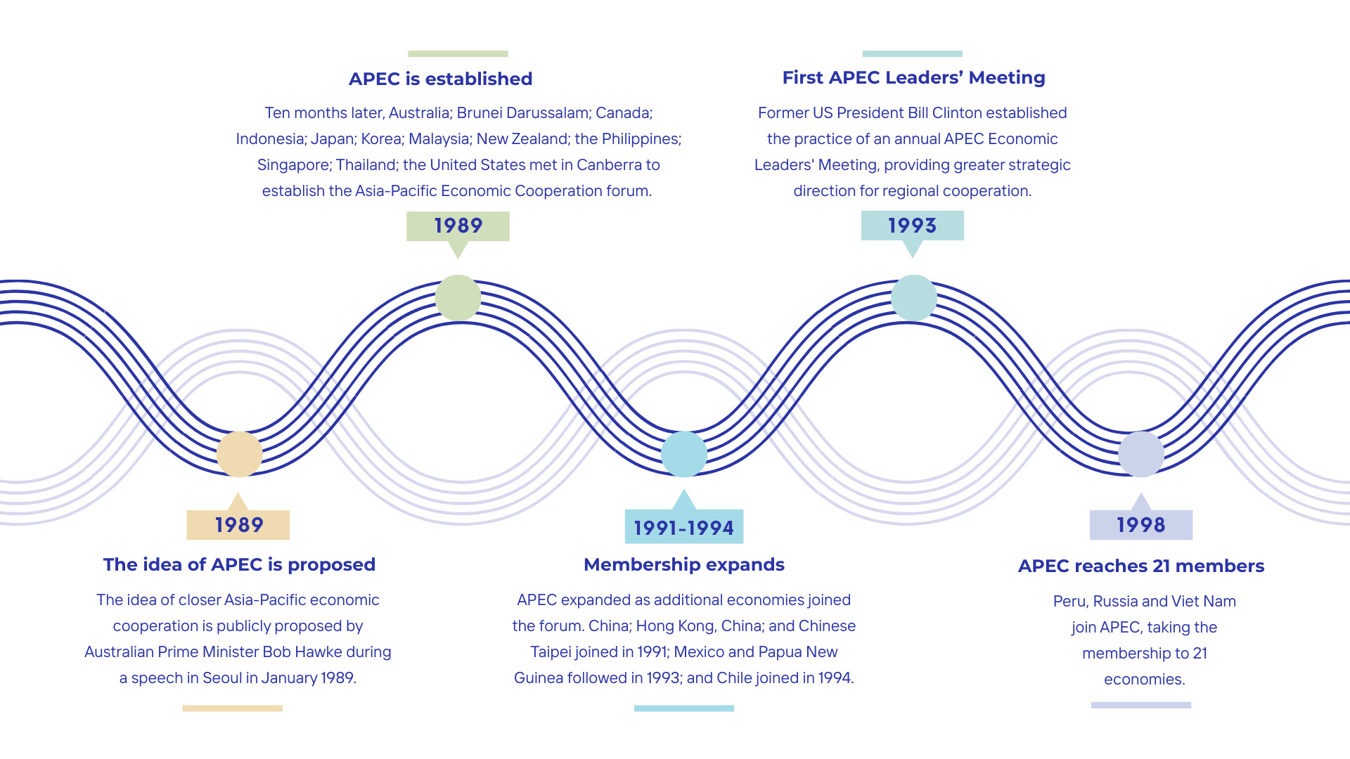 China; Hong Kong, China; and Chinese Taipei joined in 1991. Mexico and Papua New Guinea followed in 1993. Chile acceded in 1994. And in 1998, Peru; Russia; and Viet Nam joined, taking the full membership to 21.