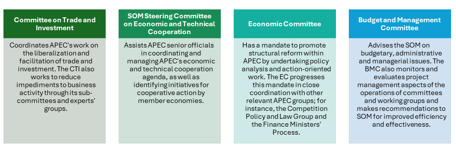 These committees guide APEC’s work programs and ensure coordination across the forum.